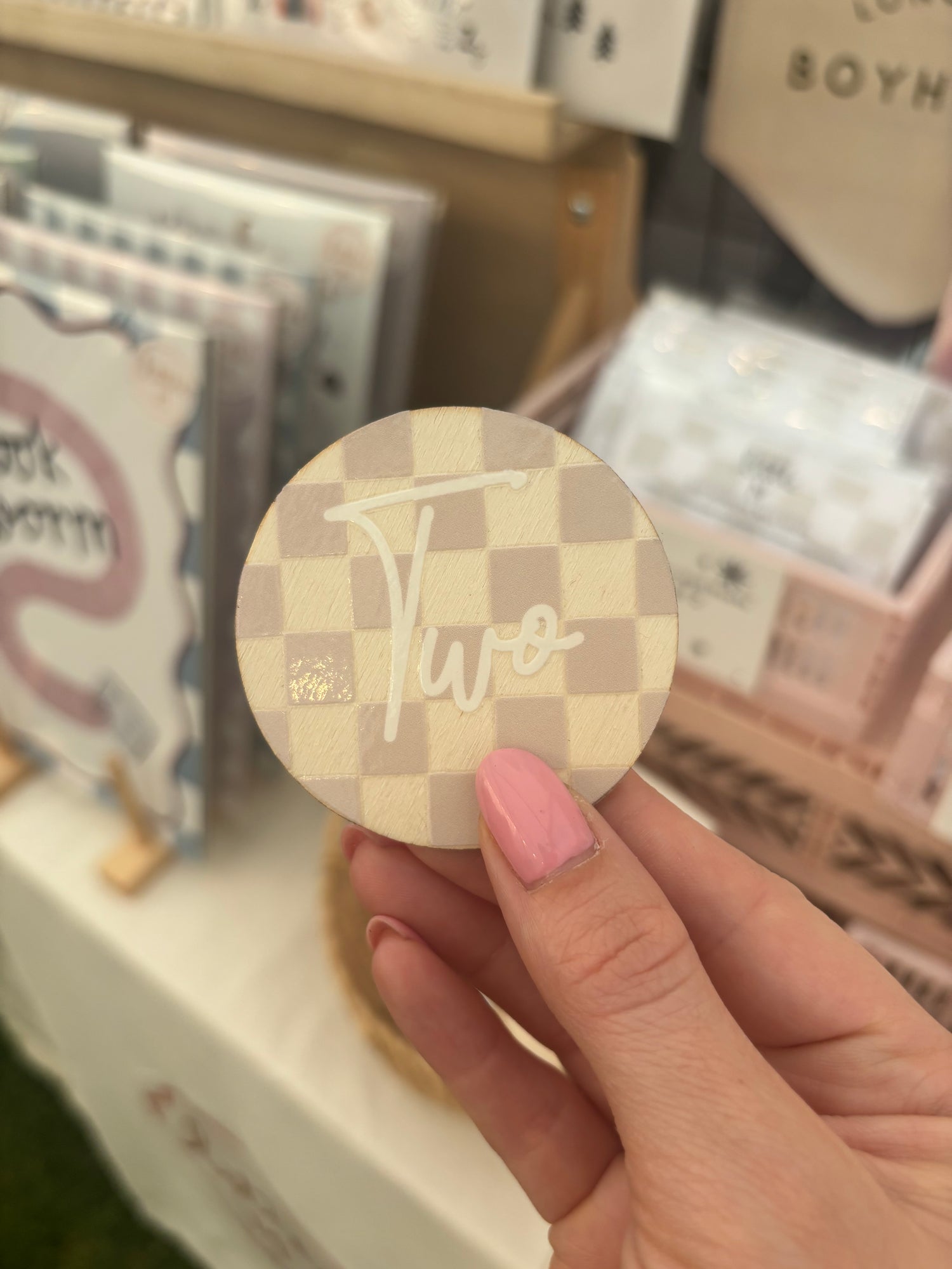 Two Wooden birthday badge with checkerboard design 4cm Birthday Sale