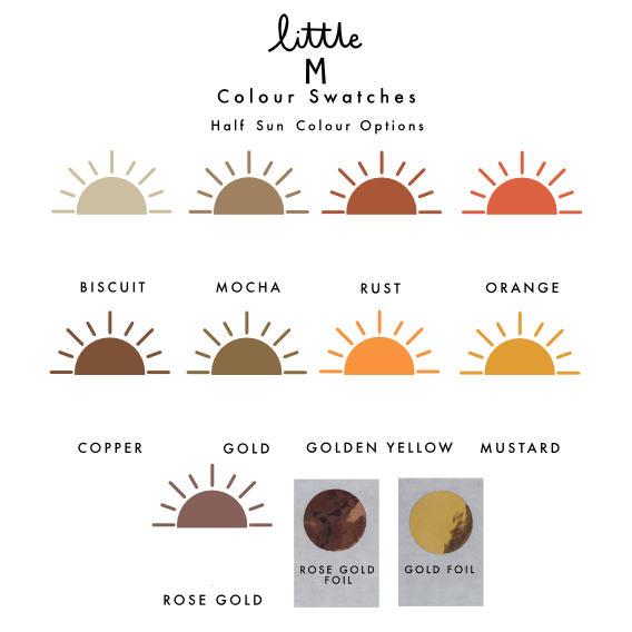 Inside a standard pack you will receive 2 A4 sheets with the 10 half suns on each sheet - 20 in total. Suns are roughly 8.5cm wide including the rays. Packs come with one colour as standard but there is now an option to create a mix and match pack where you can have 2 sheets of different colours. When ordering the mix and match packs please specify which colour you'd like in the colour option box.